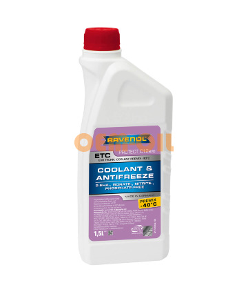 Антифриз RAVENOL® ETC Premix -40°C Protect C12evo предназначен для контуров охлаждения двигателей внутреннего сгорания на основе 1.2-этандиола (моноэтиленгликоля), обеспечивающий защиту от коррозии и замерзания. Эффективно отводит тепло за счёт великолепной теплопроводности. Продукт предназначен для долговременной защиты радиатора на основе новейшей технологии Si-OAT.